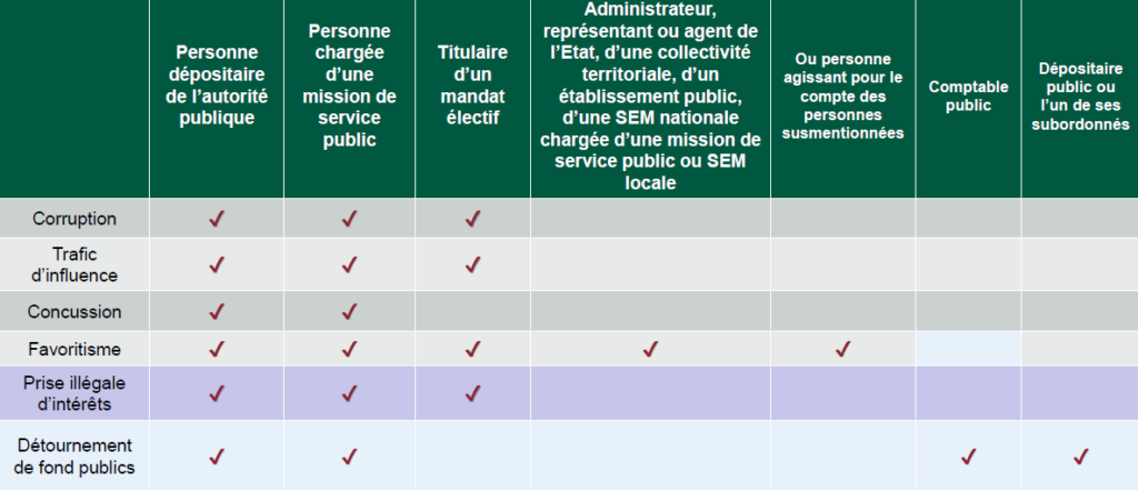 Ces infractions peuvent être commises par des personnes exerçant une autorité publique (fonctionnaires, magistrats, élus, etc.) mais aussi dans le secteur privé, notamment en matière de corruption ou de trafic d’influence.