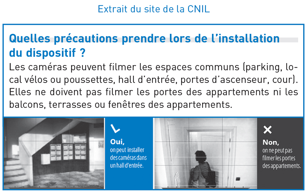- Elle n’a vocation à filmer aucun copropriétaire ni aucune partie commune générale ou partie privative autre que celle du propriétaire de l’installation (Rép. min. à QE nº 34788, JOAN Q. 13 avr. 2021, p. 3310)