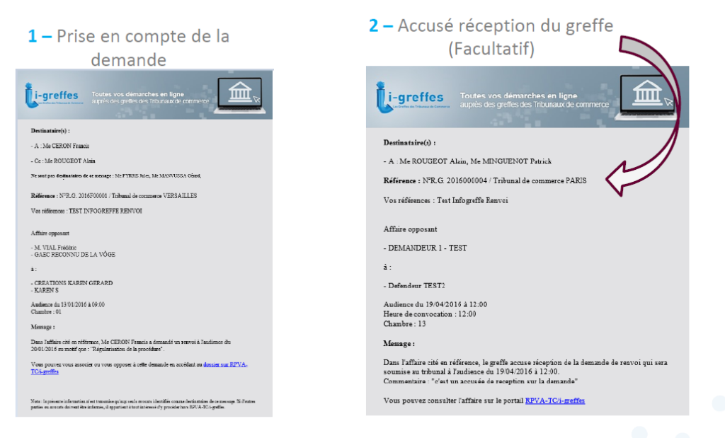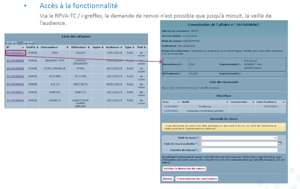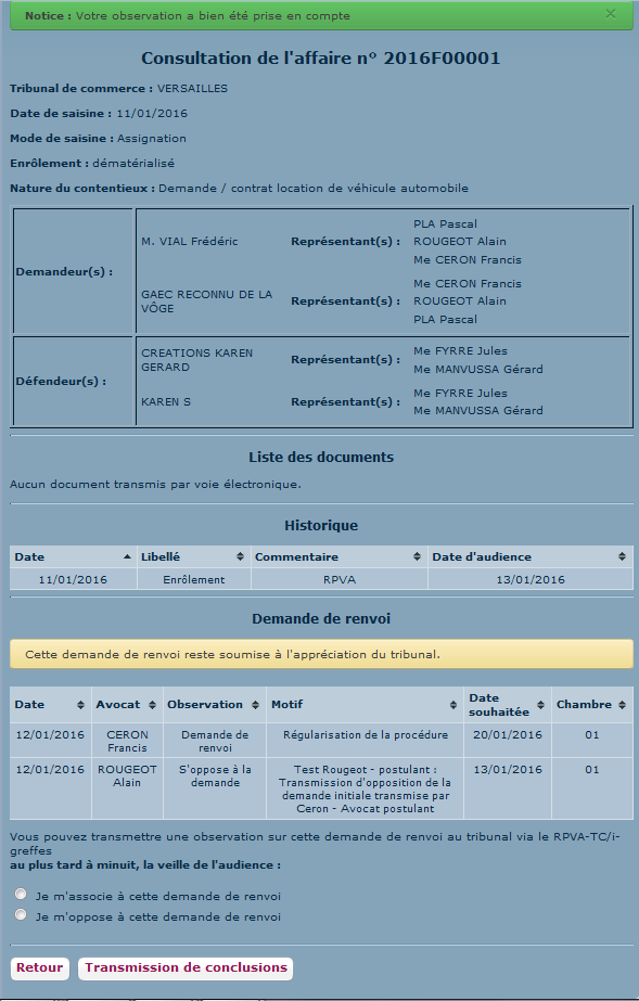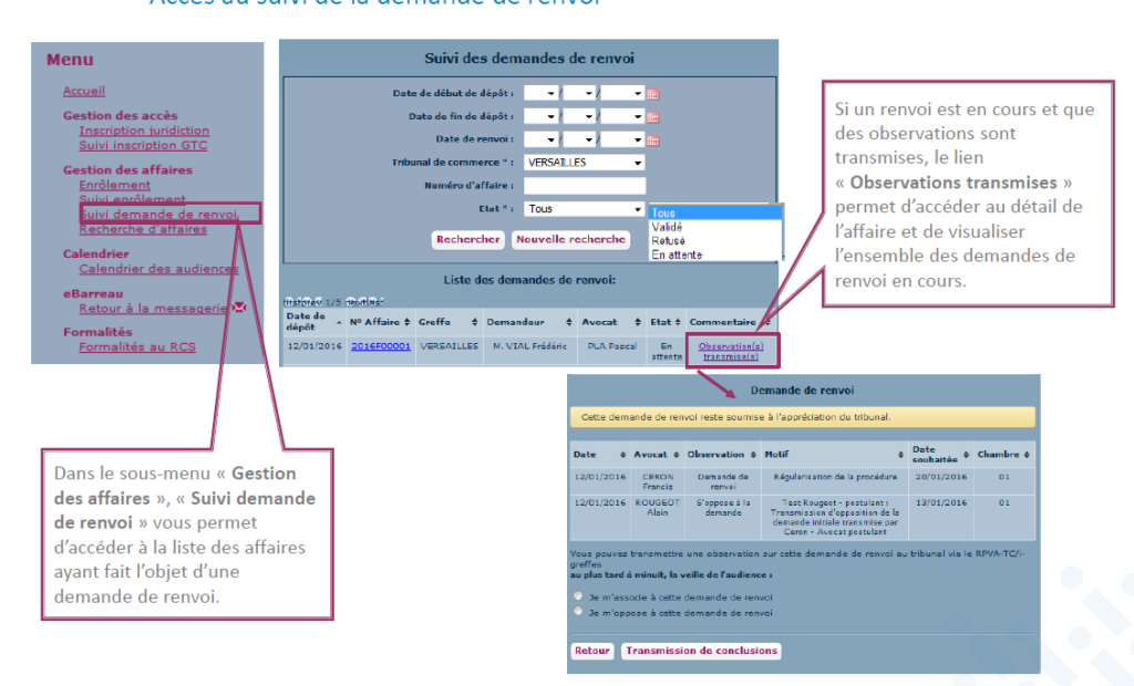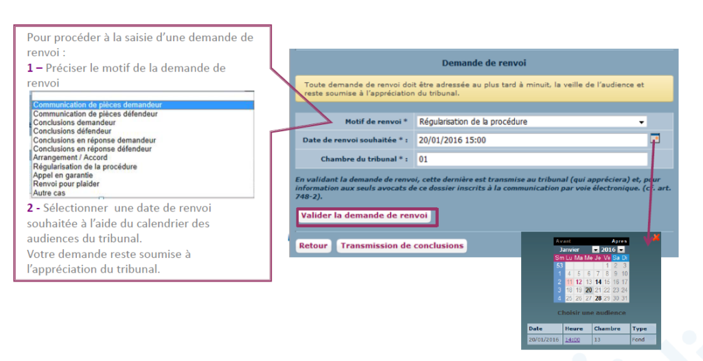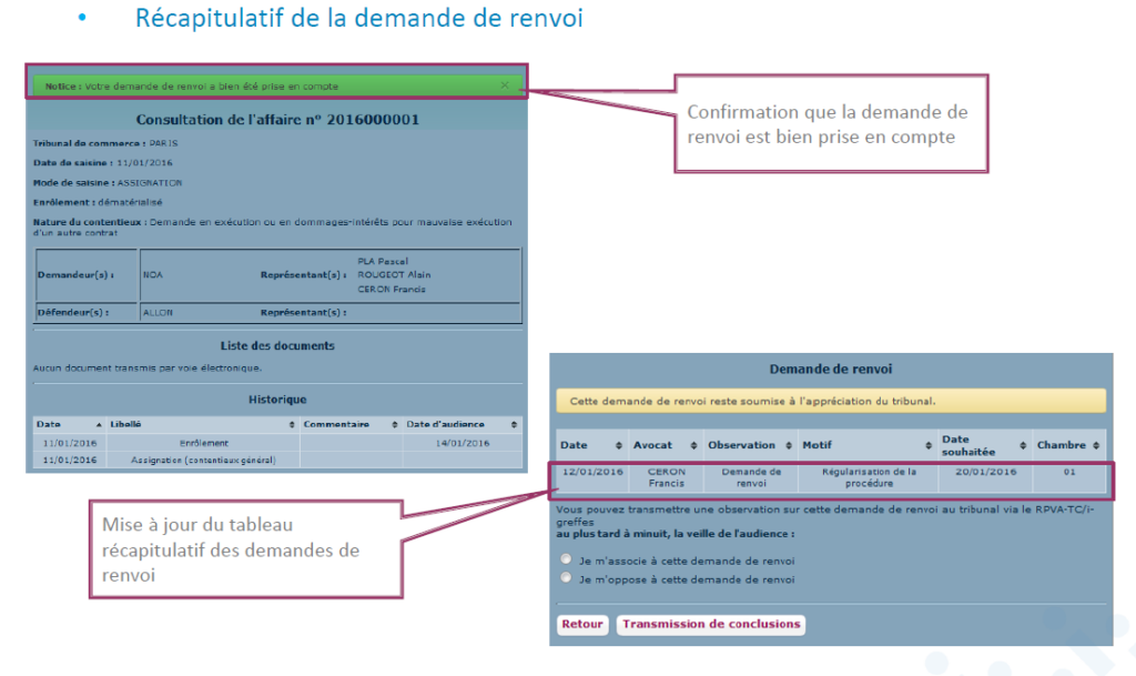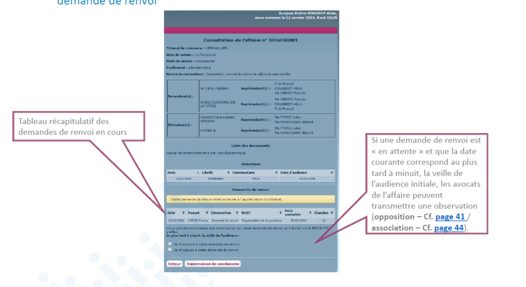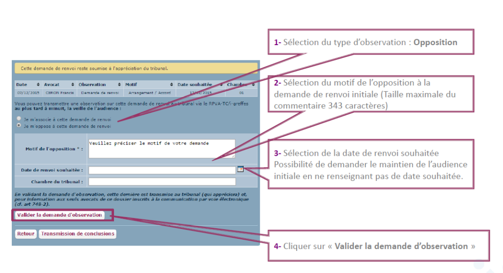 Possibilité pour les avocats de l’affaire de transmettre une observation sur une demande de renvoi