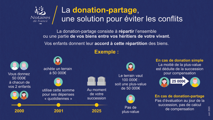 - avec une donation-partage, les biens donnés sont évalués au jour du don et ne sont pas rapportés à la succession du donateur. Si la valeur des biens donnés a augmenté ou diminué entre le jour du don et le jour du décès, cela n’a pas d’incidence sur le partage des biens entre les héritiers. La donation-partage permet donc de figer la situation et d’éviter les litiges.