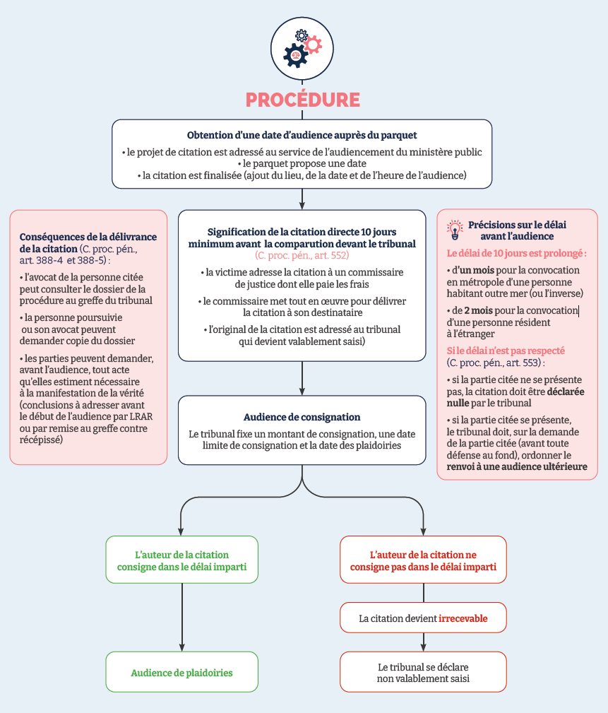 La partie civile doit obtenir du greffe du tribunal correctionnel compétent la date et le lieu de l’audience à laquelle elle souhaite que l’affaire soit jugée. Elle doit tenir compte des délais légaux entre la signification de la citation et l’audience, qui sont de 10 jours (article 552 du code de procédure pénale), éventuellement augmentés des délais de distance (1 ou deux mois).