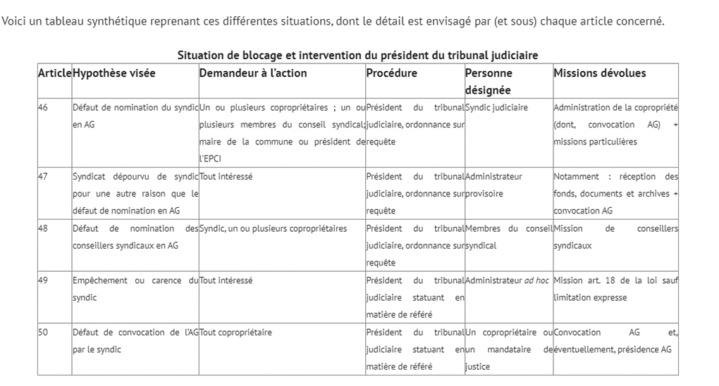 - tous les autres cas où le syndicat est dépourvu de syndic (mandat du syndic arrivé à son terme, mandat annulé ou encore démission du syndic) et où le président du tribunal, statuant par ordonnance sur requête, peut désigner un administrateur provisoire chargé de convoquer une assemblée générale en vue de la désignation du syndic (art. 47).