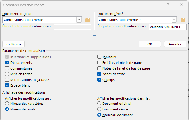- Choisir ses conclusions n°1 dans document original et ses conclusions n°2 dans document révisé