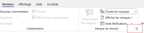 - cliquer sur la flèche en bas à droite de « marque de révision »